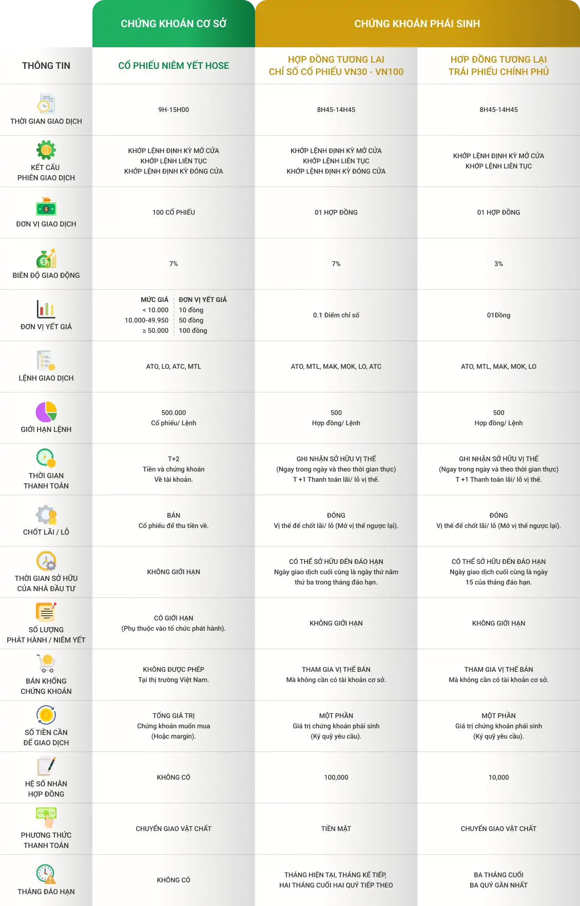 Giá trị ký quỹ yêu cầu (MR) | Cập nhật theo Giá thị trường của Vị thế nắm giữ. | Cập nhật vào cuối ngày theo Giá của tài sản cơ sở (HĐTL chỉ số), Giá trái phiếu Chính phủ/chỉ số trái phiếu Chính phủ (HĐTL TPCP). | ||