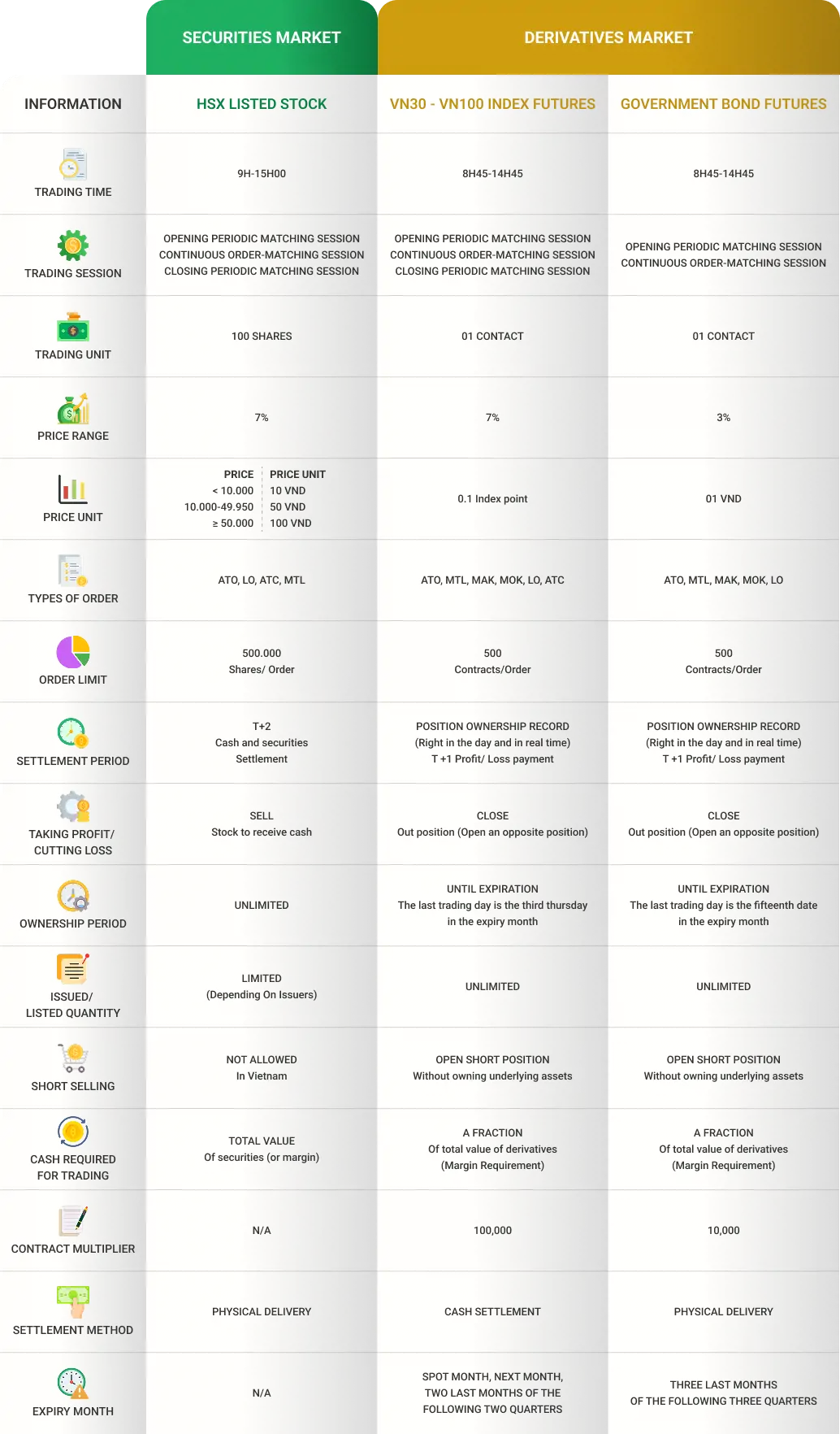 Ngày giao dịch cuối cùng | Ngày cuối cùng một hợp đồng được giao dịch trong tháng đáo hạn của hợp đồng đó. Hết ngày giao dịch cuối cùng, tất cả các vị thế đang nắm giữ đối với hợp đồng đáo hạn sẽ được thanh toán, hợp đồng này sẽ được hủy niêm yết và một hợp đồng mới cùng tài sản cơ sở có kỳ hạn xa nhất theo quy định sẽ được niêm yết mới. |